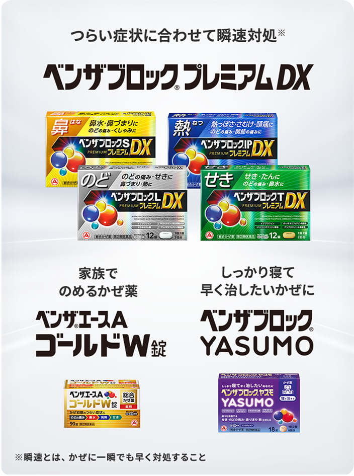 いつでも頼れる存在でありたいと考えています。 これからのかぜに、新時代の優れた効き目を。 そして、あなたのかぜに、もっと狙いを決めて。 ベンザは、いつも頑張るあなたのために、これからも進化を続けてまいります。